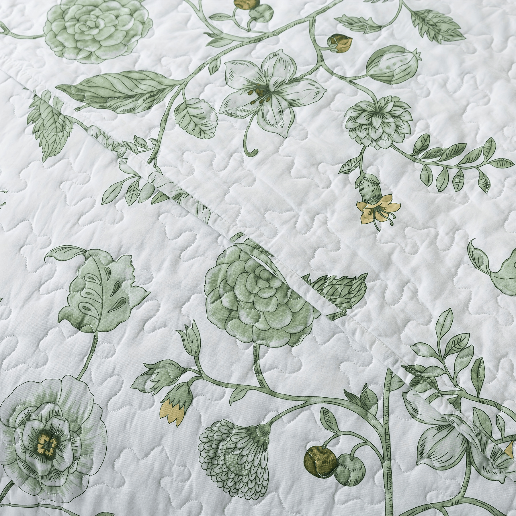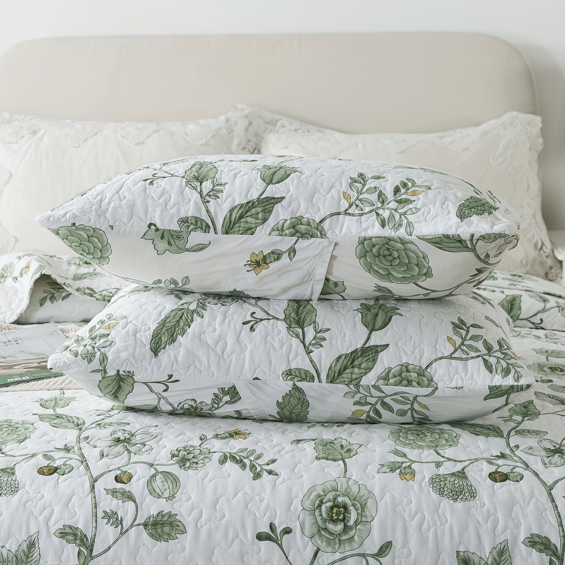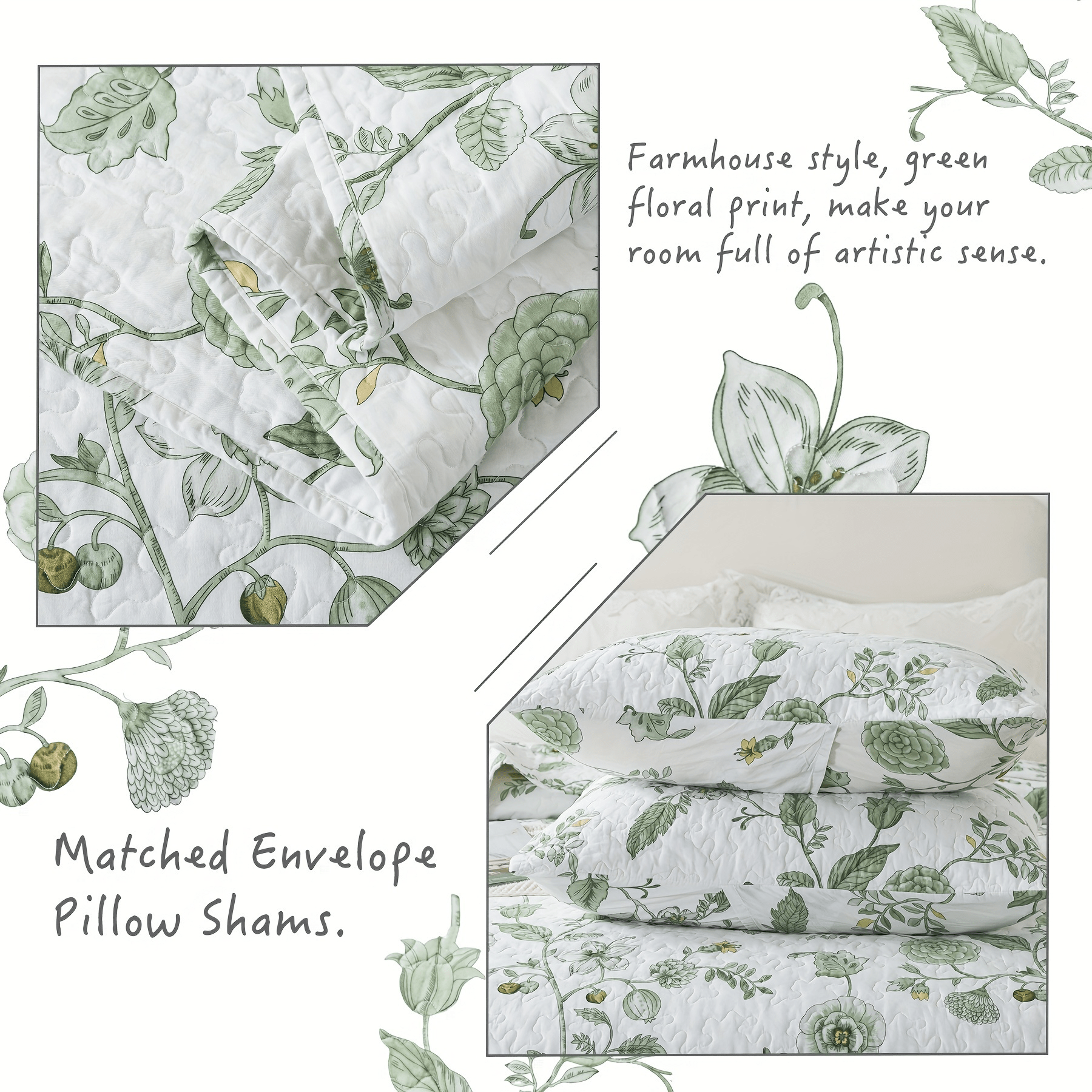 100% Floral Pattern White Quilt Set, Green Flower Print Farmhouse Summer Bedspread Set, Soft Breathable Lightweight Rustic Coverlet Bedding Sets, for All Season, 3pcs Twin Size 2pcs