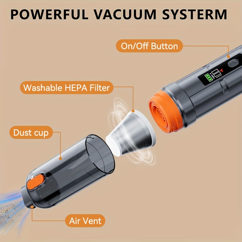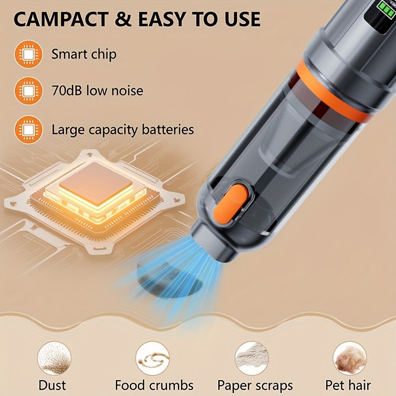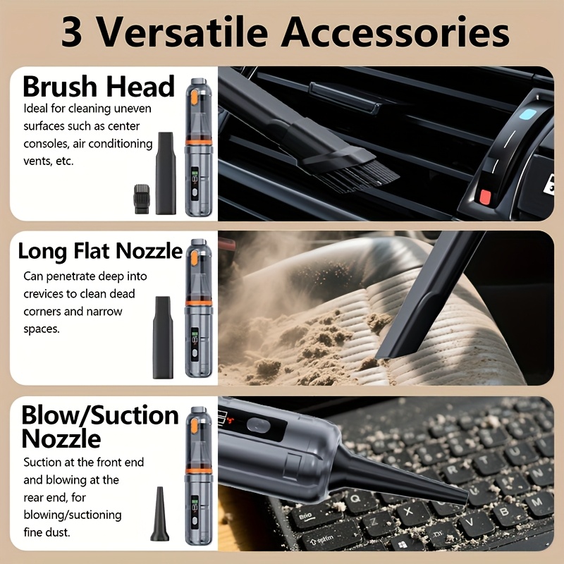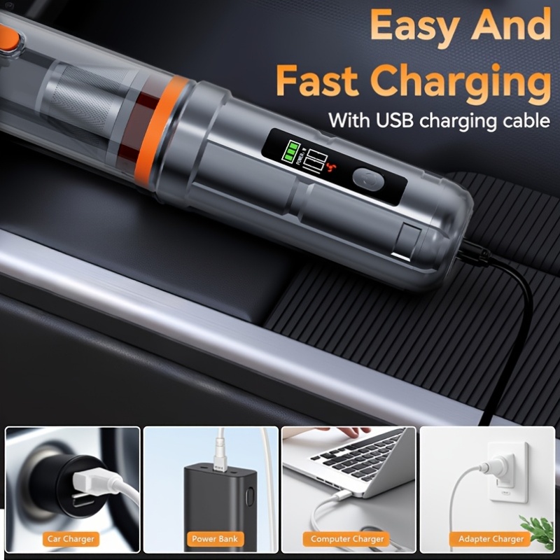 The “Portable Car Vacuum Cleaner” is supported by a high-capacity, “USB Rechargeable” battery system. This universal charging infrastructure allows the unit to be replenished via a vehicle’s onboard port, a laptop, or a standard power bank, ensuring “ever-ready” status for spot-remediation. Its compact, balanced chassis makes it “Suitable for Cars, Homes, Keyboards, etc.,” providing a singular solution for a wide range of surface types, from rugged floor mats to delicate electronic components.