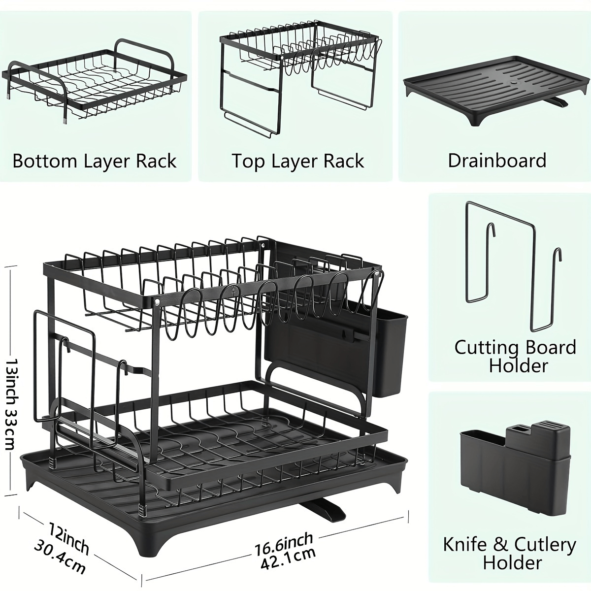 2 Tier Dish Drying Rack For Kitchen Counter, Dish Drainers For Kitchen Counter With Drainboard, Metal Kitchen Dish Rack With Drain, Kitchen Drying Rack Two Tier, Black Dish Racks