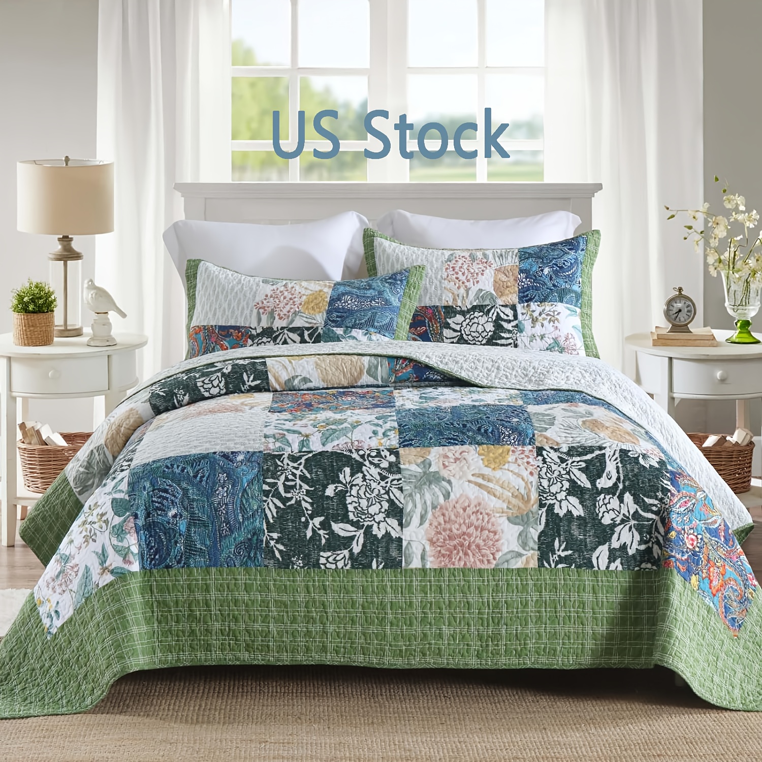 3 Pcs 100% Cotton Bohemian Floral Pattern Comforter Set Bedding Set, Soft Reversible Lightweight Bedspread and Coverlet with 2 Pillow Shams, Green, King Size, Queen Size