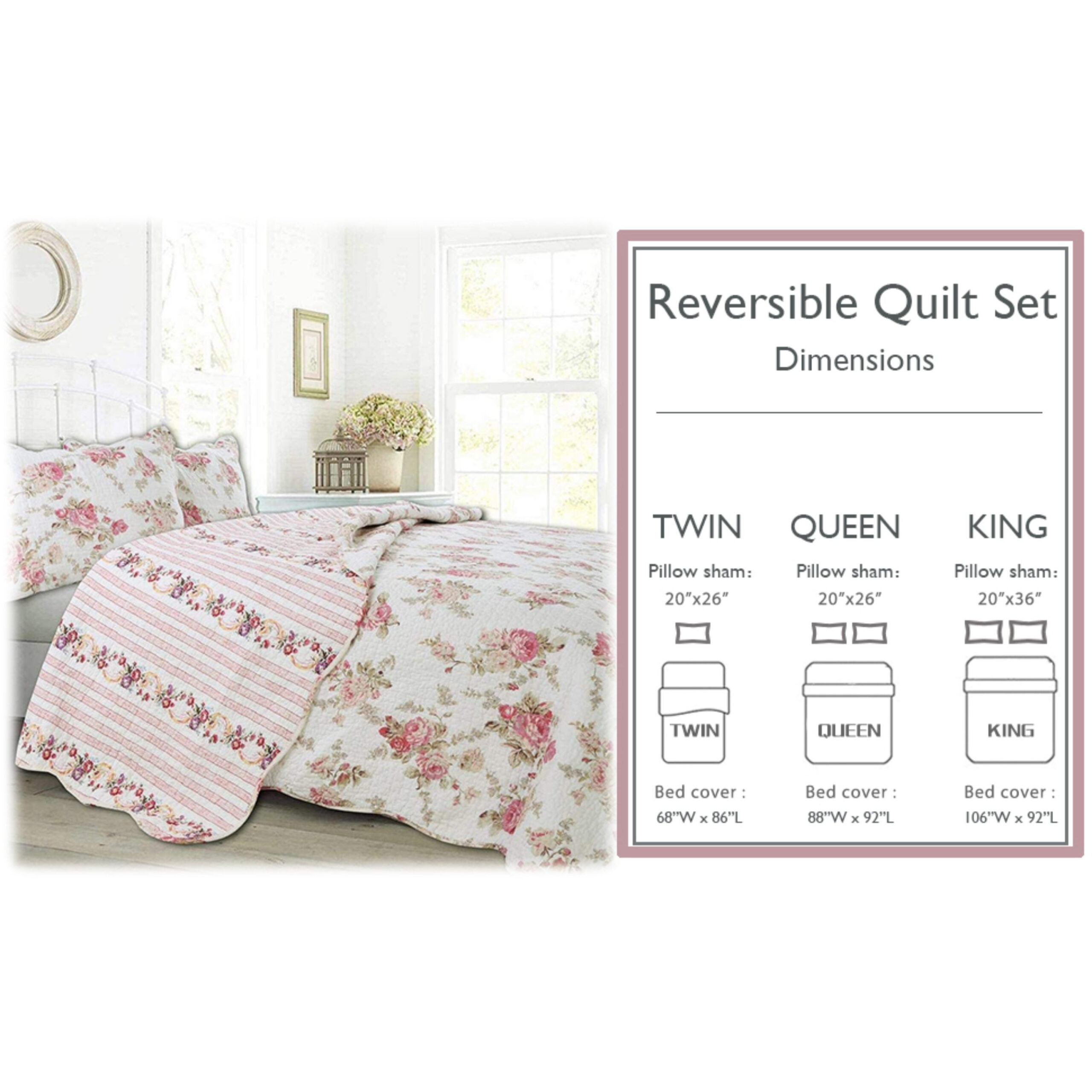 3pc 100 Cotton Shabby Chic Pink Peony Floral Reversible Quilt Bedding Set, Lightweight Bedspread Coverlet for All Seasons