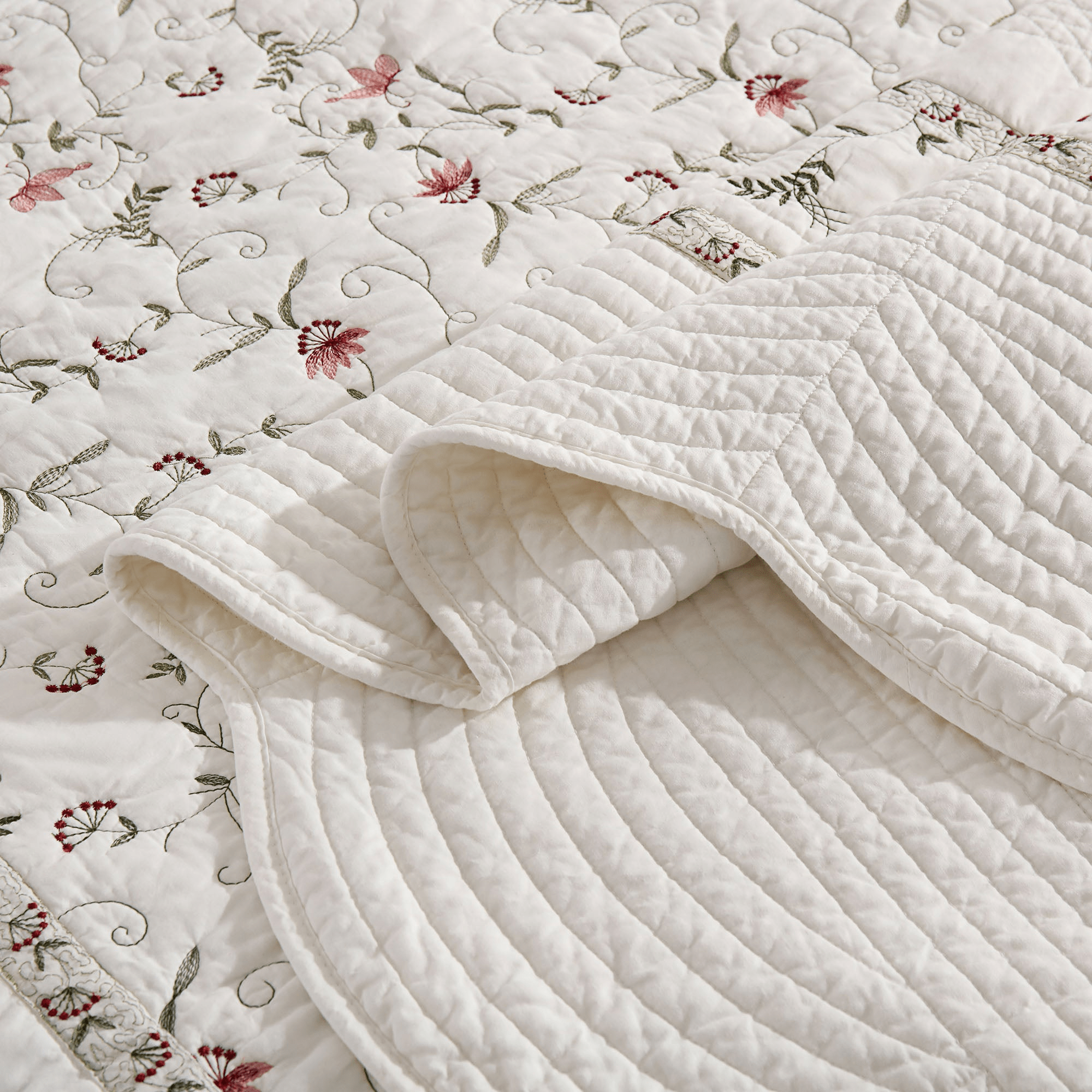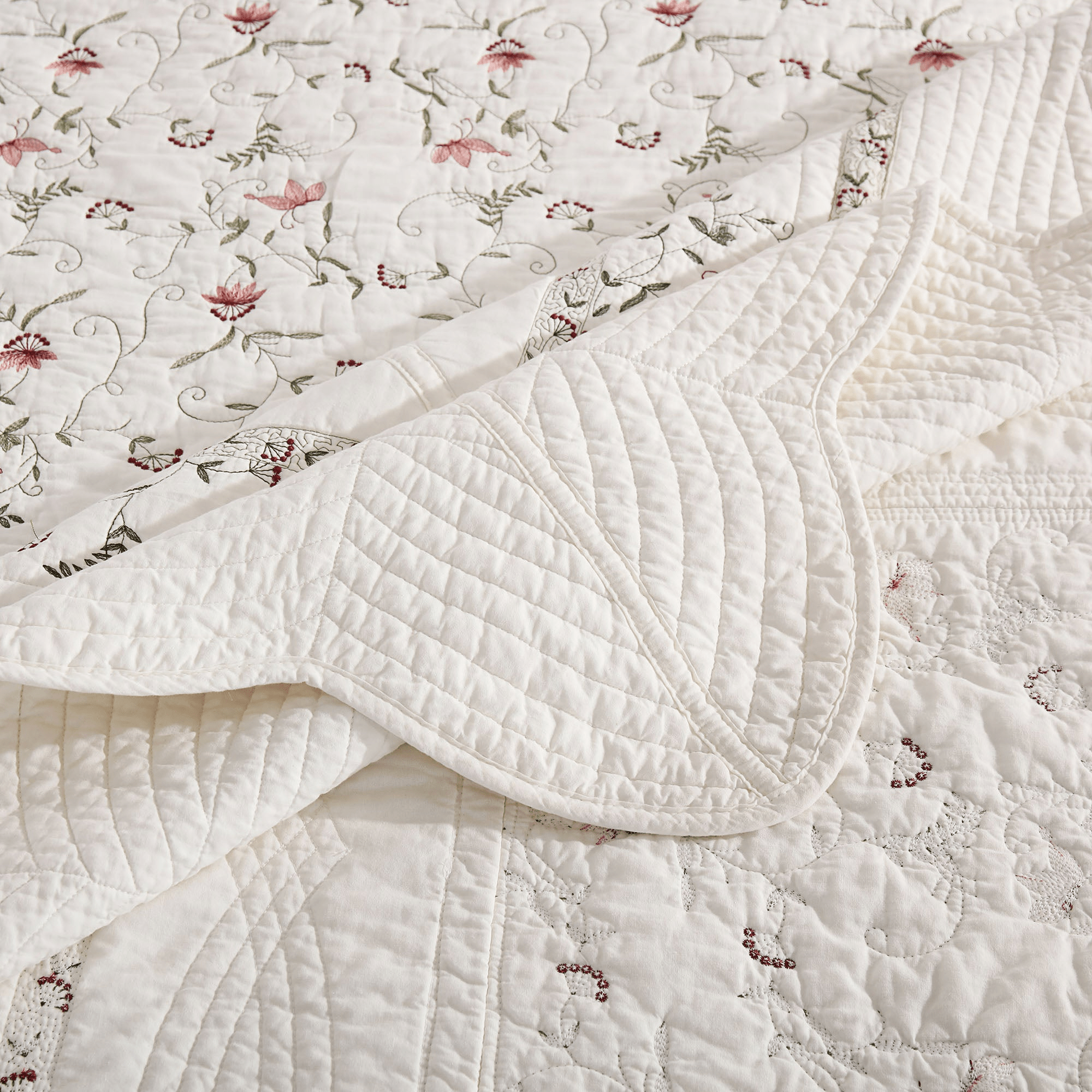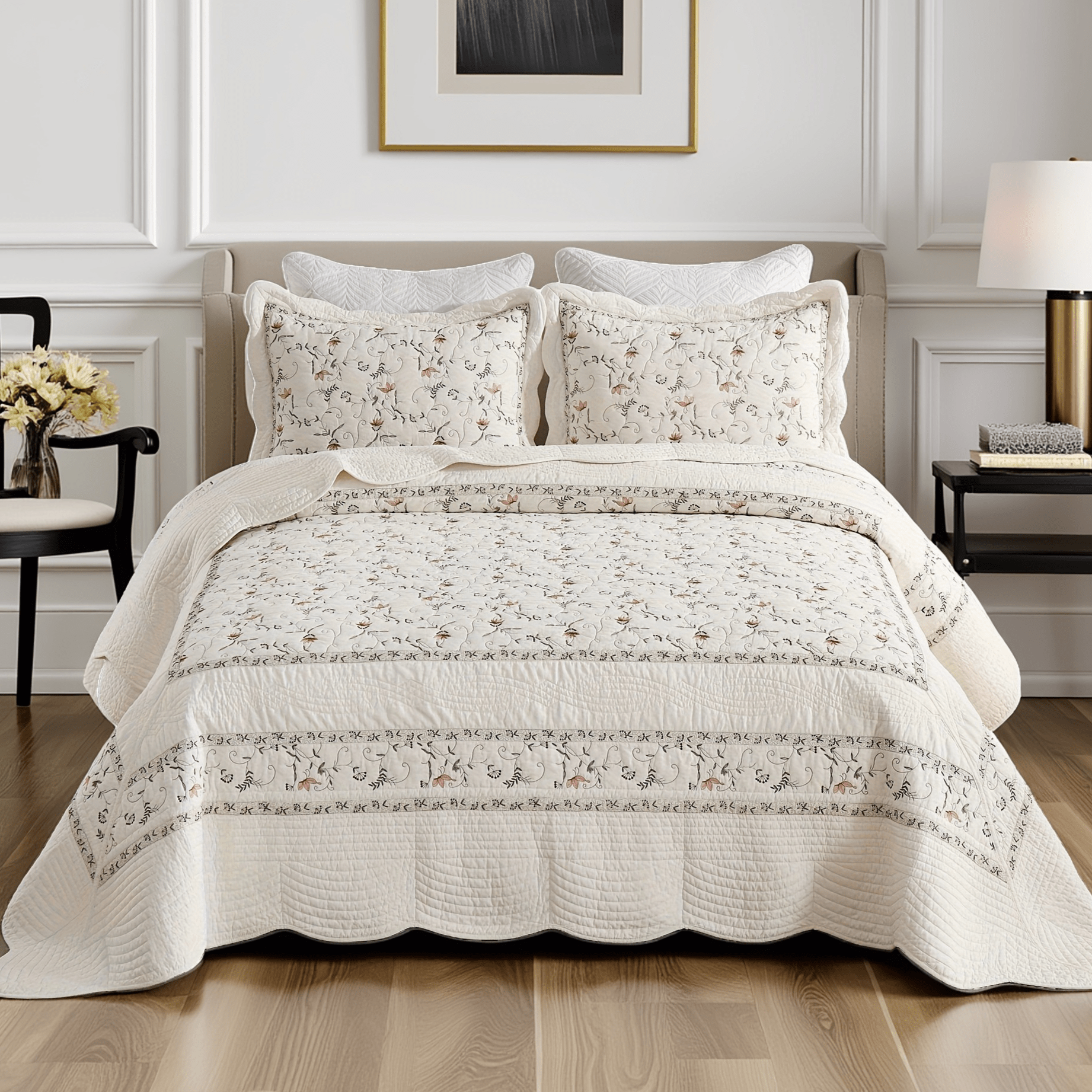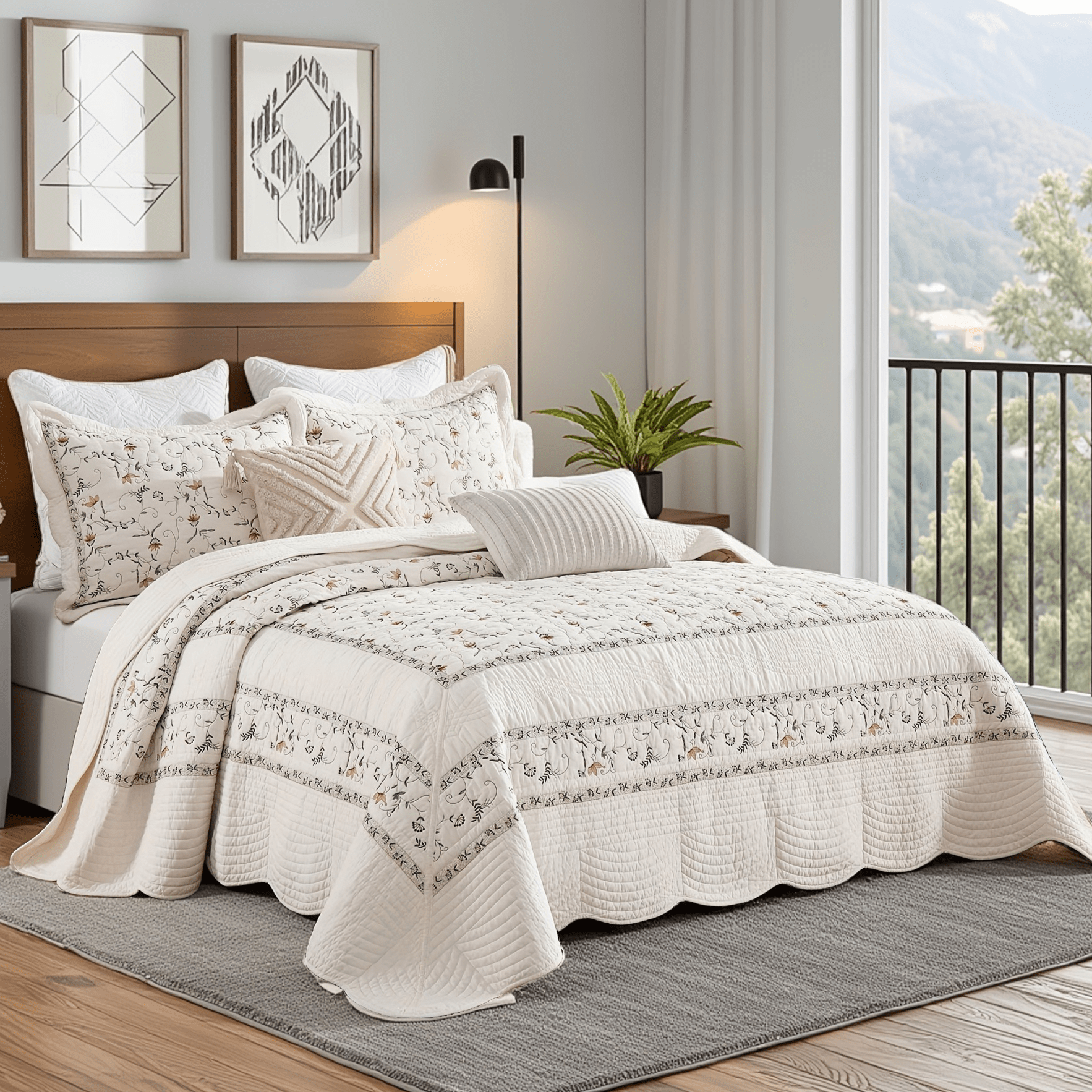 3PCS Cotton Embroidery Delicate Fan-shaped Edge Cream White Quilt Set Bedspreadset and Quilt Cover Quilting Design At Home Dormitory Easy Care Bedding Supplies for All Seasons