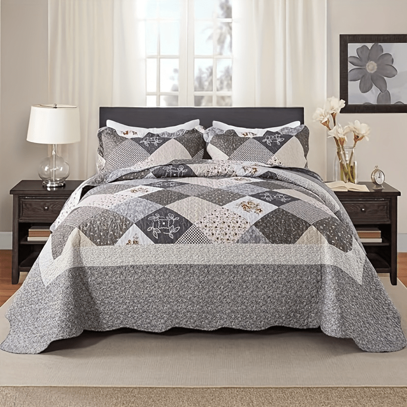 3pcs Elegant Flower Plaid Reversible Patchwork Bedspread Set, Lightweight Bedspreads Reversible Coverlets Retro Bed Cover Soft Breathable And Comfortable Quilted Bedding Coverlet Set For Bedroom Dorm Room