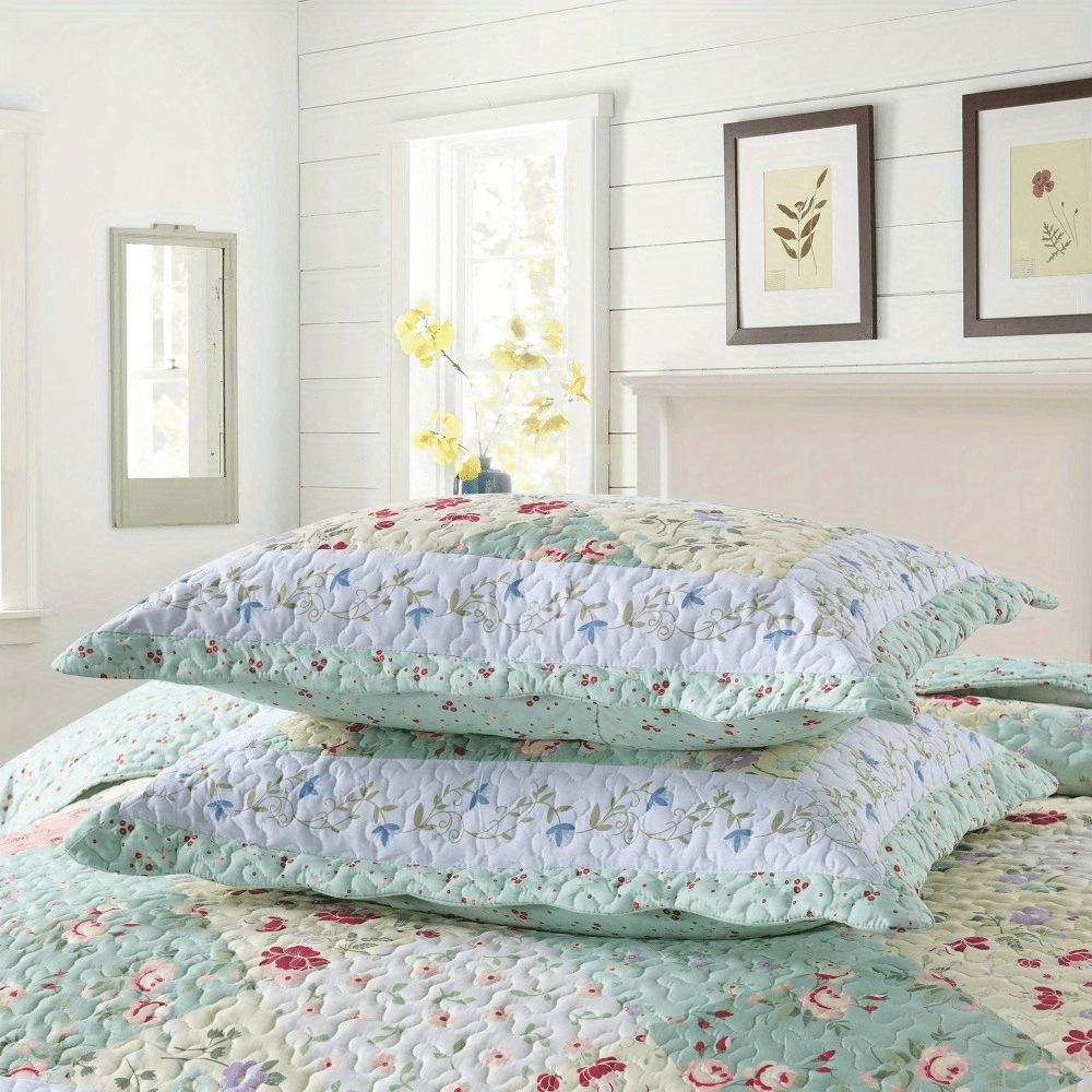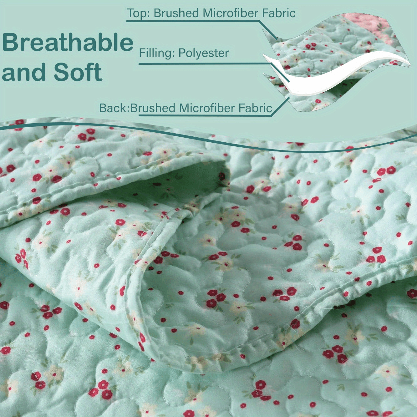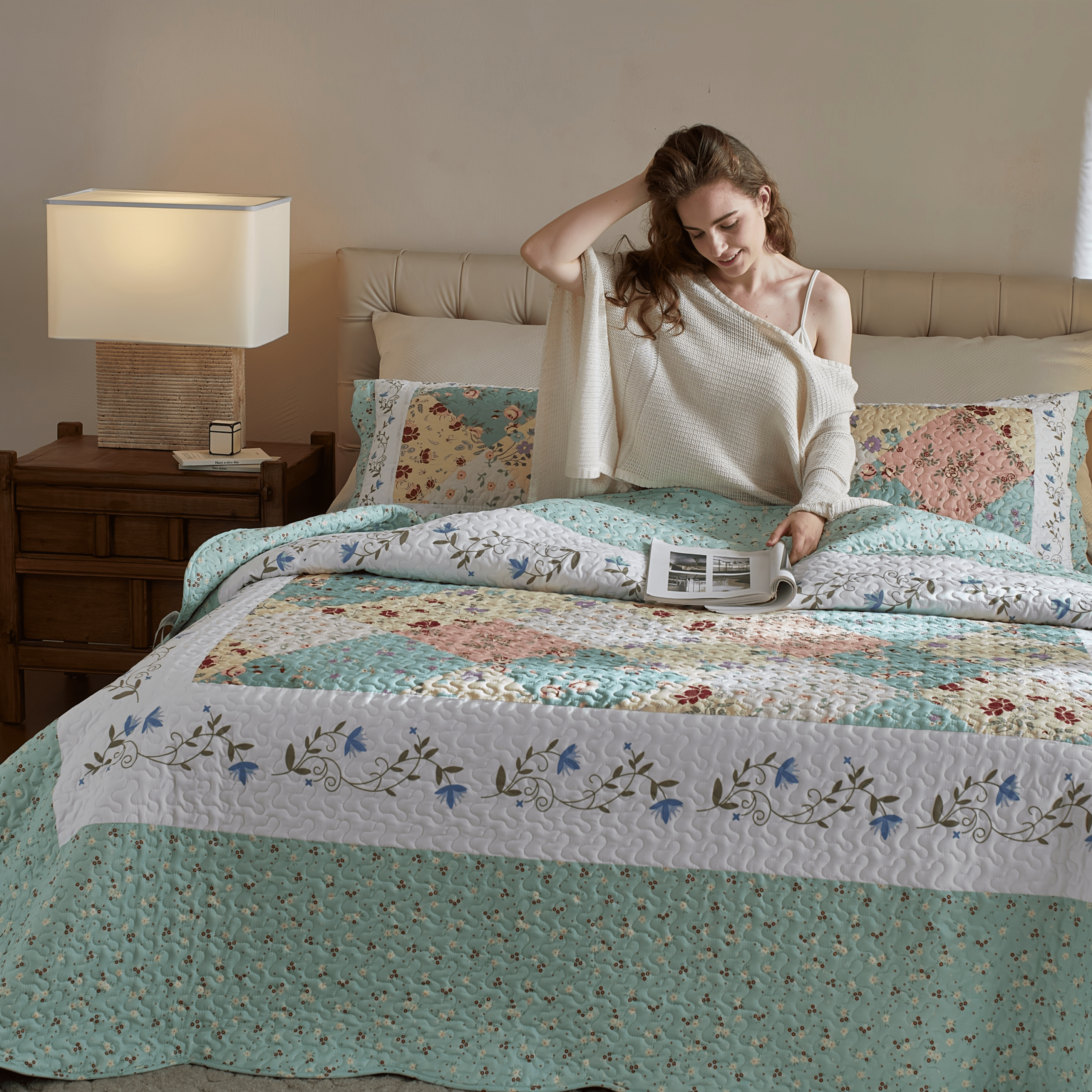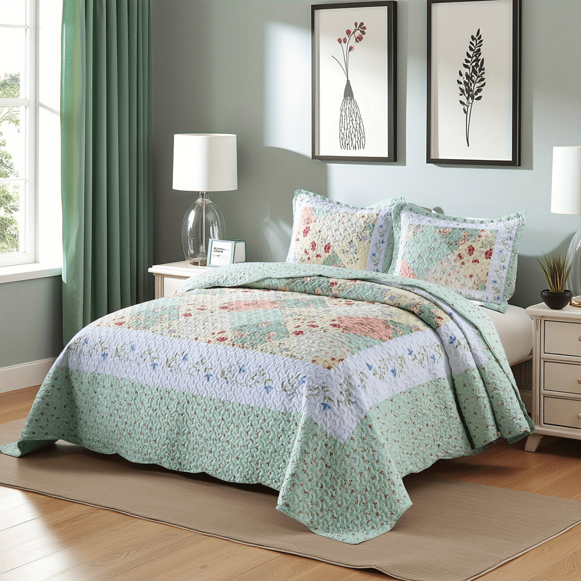 [3pcs Green Quilt Set] 3pcs Reversible Green Patchwork Quilt Set | Lightweight Bedding with 2pcs Pillow Shams | All Season