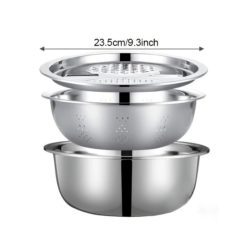3pcs Stainless Steel Kitchen Set with Integrated Grinder, Multi-Purpose Filter and Mixing Bowl – Ideal for Cleaning and Slicing Fruits, Vegetables, and Cheese | Food Safety with Drainage System, Perfect for Home Cooking, Kitchen Grinder