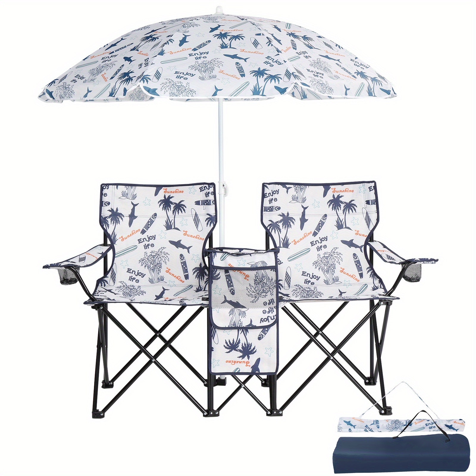 Specifications:1. Seat Height: 15.2 in / 38.5 cm2. Seat Width: 18.9 in / 48 cm3. Seat Depth: 14.4 in / 36.5 cm4. Back Height: 16.3 in / 41.5 cm5. Overall Chair Length: 54.3 in / 138 cm6. Overall Chair Width: 17.1 in / 43.5 cm7. Overall Chair Height: 30.9 in / 78.5 cm8. Umbrella Height: 61 in / 155 cm9. Umbrella Diameter: 55.1 in / 140 cm10. Middle Storage Bag Width: 9.4 in / 24 cm11. Carrying Bag Dimensions: (31.5 x 11.4 x 7.1) in / (80 x 29 x 18) cm