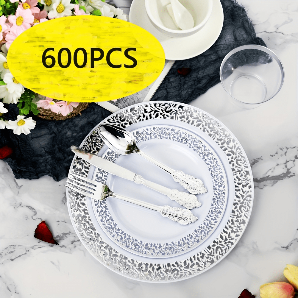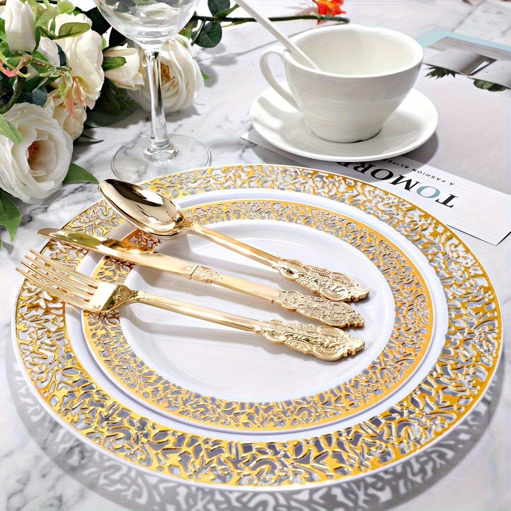 600pcs Golden Plastic Dinnerware Set, Golden Plastic Plates Set, 120pcs Golden Dinnerware Plates, 120pcs Golden Dessert Plates And 120pcs Golden Cutlery, Party Plasitc Cutlery, Golden Plsatic Silverware, for Wedding, Brithday, Party Serving 120 Guests.