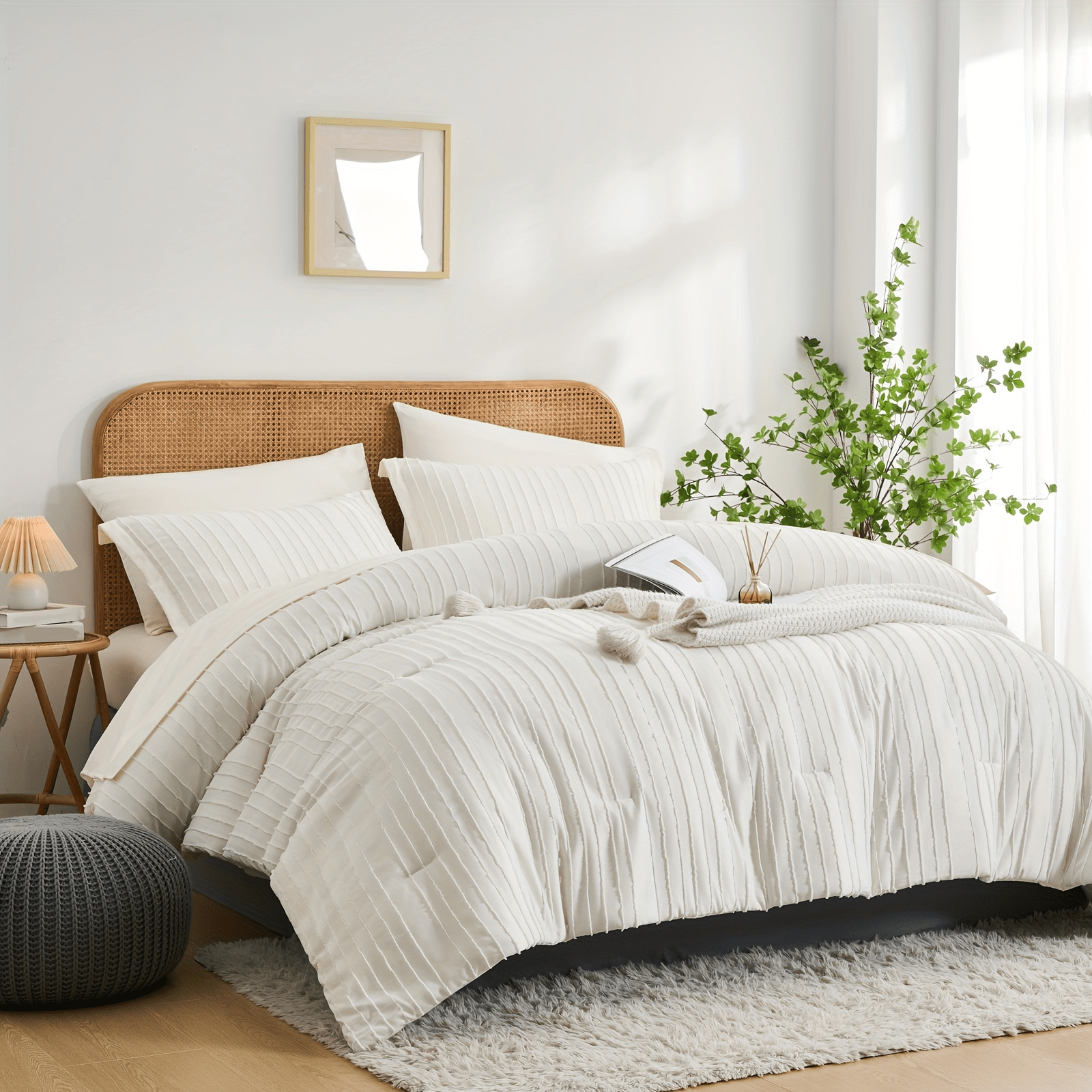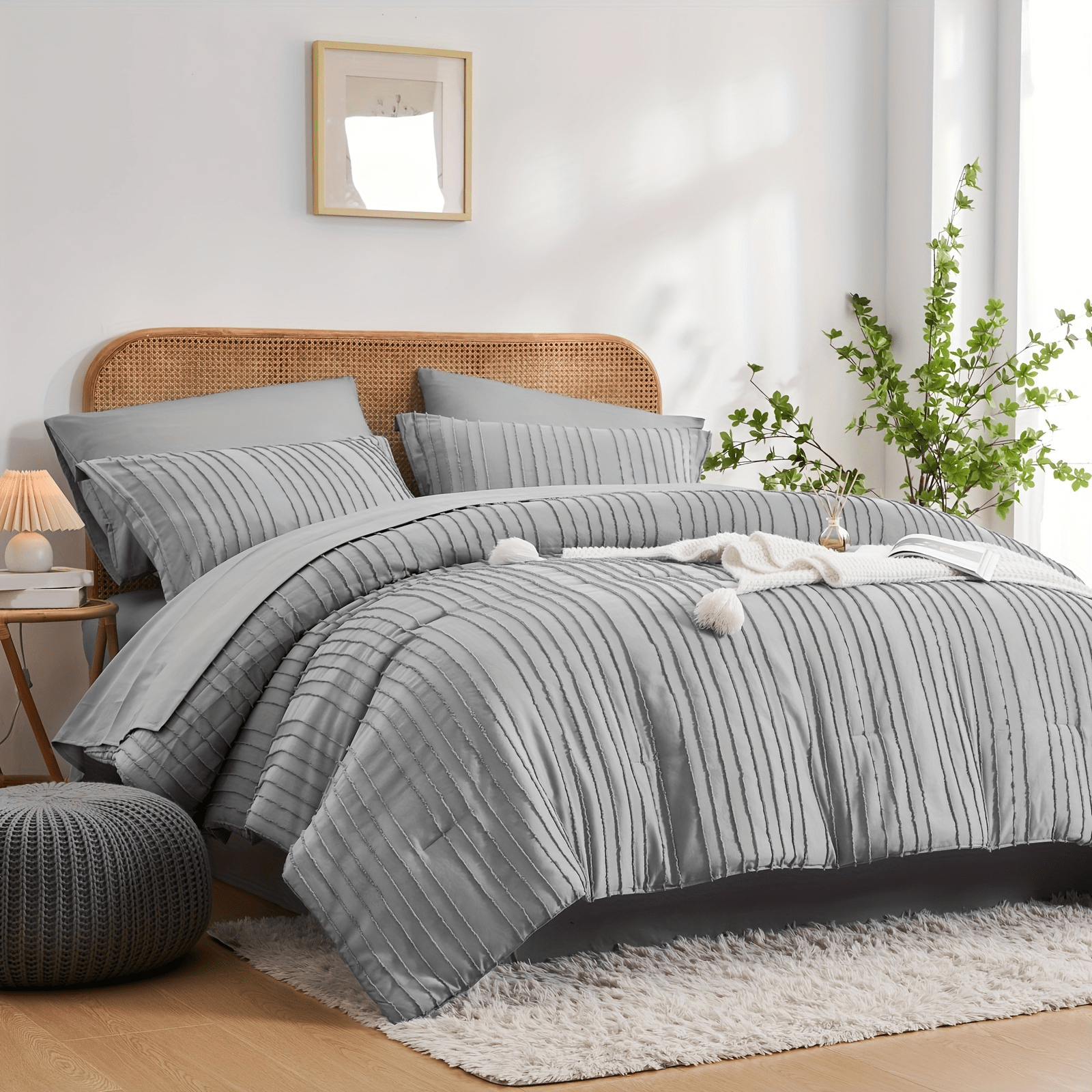 7pcs Striped Textured Pattern Bed Set, Shabby Chic Boho Comforter Sets, Queen/King Size Bed In A Bag, Soft Microfiber Lightweight Bedding Set for All Seasons