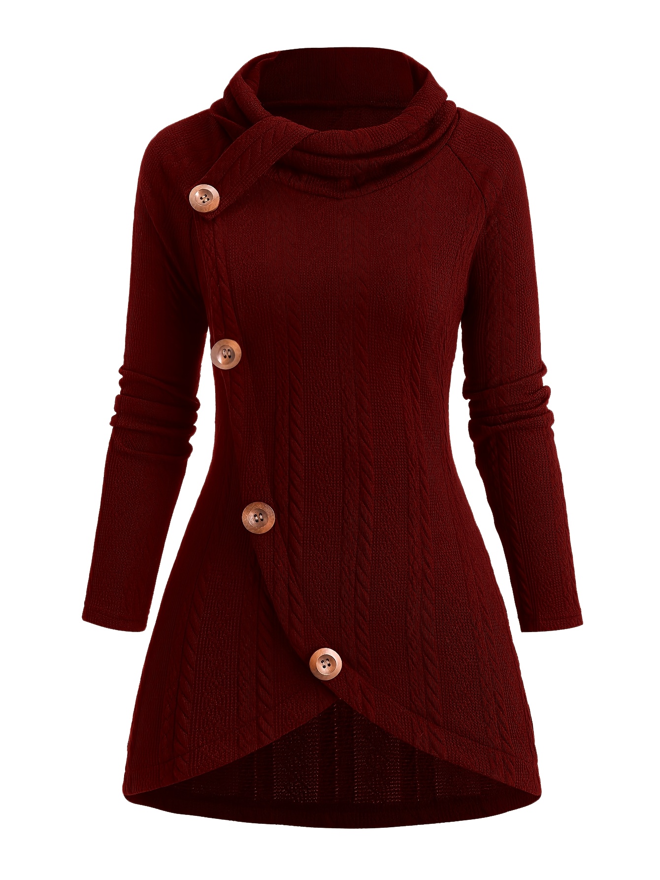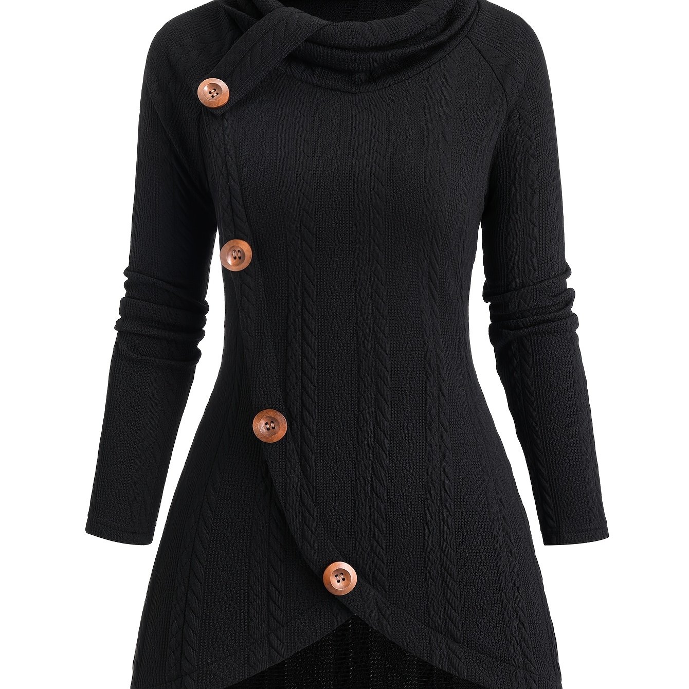 Asymmetrical Decorative Buttoned Long Sleeve Top | High Neck, Solid Color, Casual Style for Fall/Winter