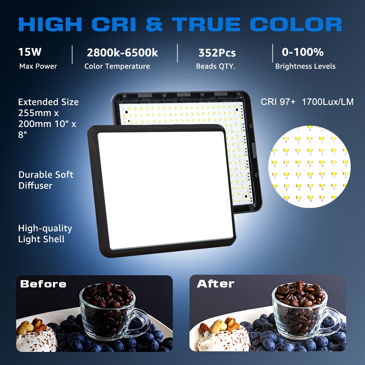【LED Video Kit Studio Light Photography 】Provide 3 Color Temperatures (2800K, 4800K & 6500K)to Create Various Lighting Atmosphere; This Upgraded Studio Light Which Is Equipped With 352 Led Beads To Make The Light More Ample And Avoid Unnecessary Shadows. Features A High CRI Of 97+ For Precise Color Rendering. Adjust The Brightness In A Range Of 10 To 100% With Button Up And Down On Remote To Meet Different Photography Circumstances, Offering Extra Lighting For Your Works.