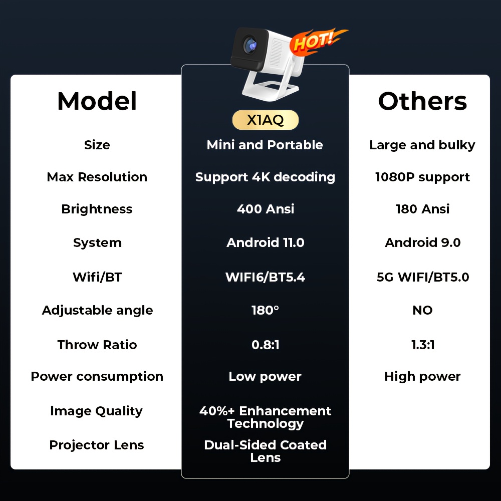 4K Input and Native 720P Scaling: While maintaining a Native 720P resolution for efficiency, the internal chipset supports 4K decoding. This allows the projector to process ultra-high-definition signals and scale them using “Contrast-Enhancement” algorithms to deliver a crisp, vivid image at 400ANSI lumens.