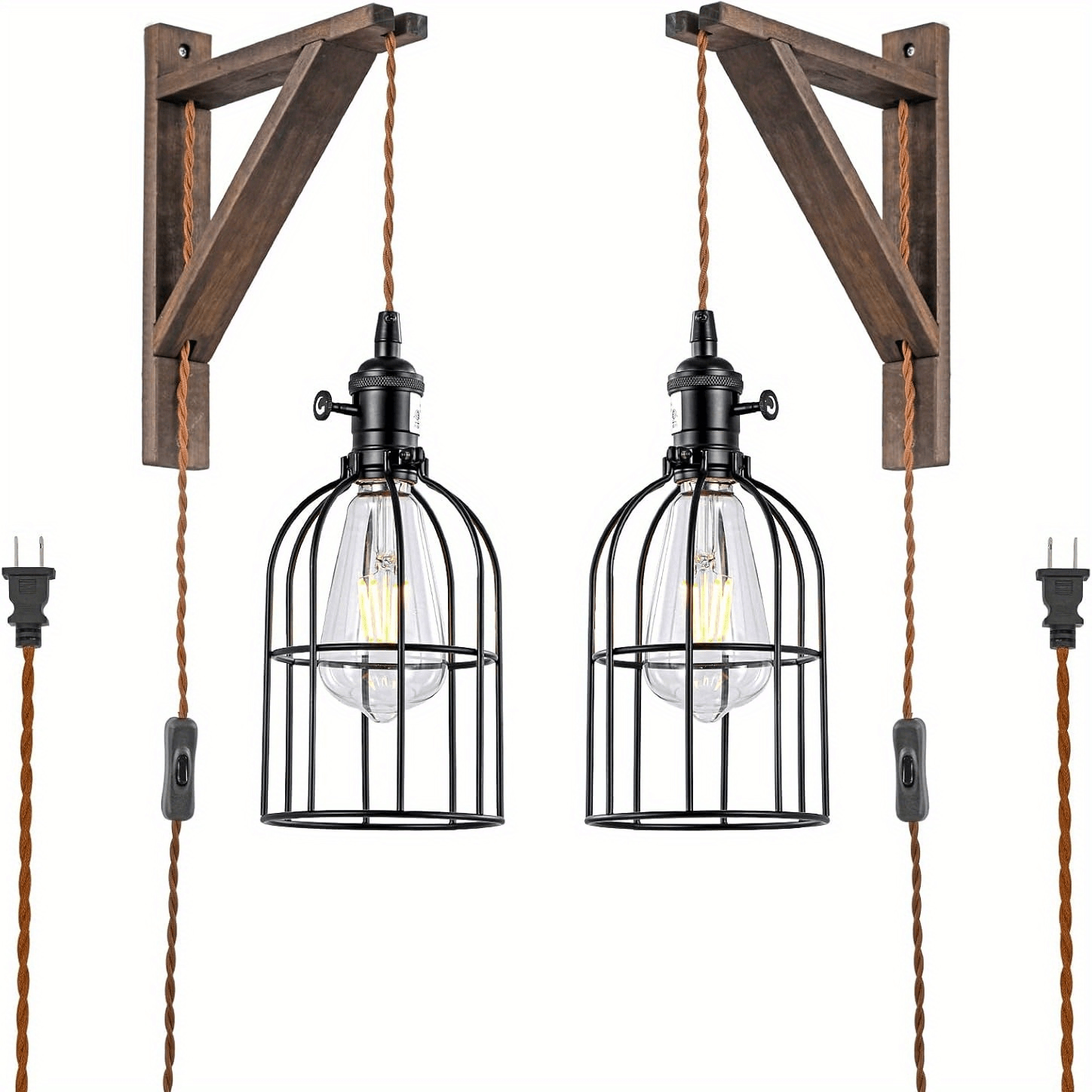 Plug In Wall Sconces Set Of 2 Or 1, Farmhouse Hanging Lamps That Plug Into Wall Outlet, Rustic Metal Cage Sconce with Wooden Bracket for Bedroom Living Room Headboard.