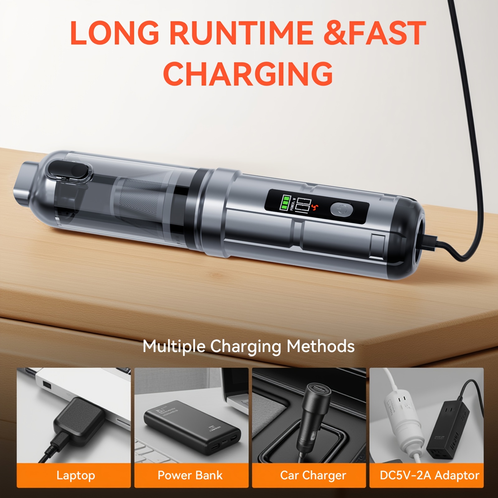 In today’s mobile world, power versatility is essential. This portable car vacuum cleaner features a high-capacity internal battery that is fully USB rechargeable. Whether you are charging it via a laptop, a power bank, or your car’s built-in USB port, the device is always ready for a quick “touch-up” or a deep-clean session. The lithium-ion technology ensures that the suction remains strong from the first minute of use until the last, providing a reliable cleaning experience every time.