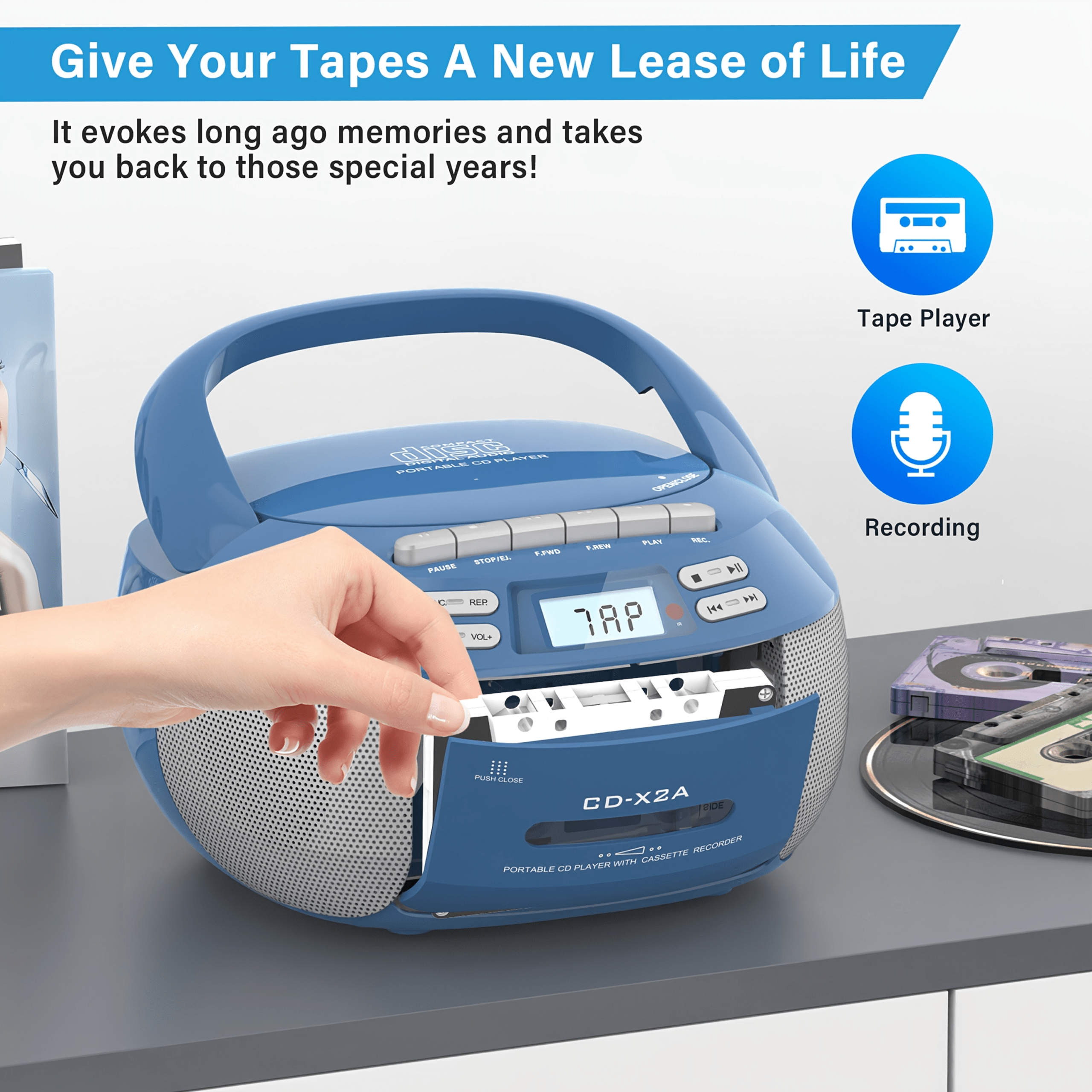 Portable CD Player & Cassette Recorder Combo with Remote Control, Stereo Sound, AC/Battery Operated, LCD Display, Support CD/AUX/USB/Earphone/Wireless, Infrared Remote Control, AM FM Radio for Home