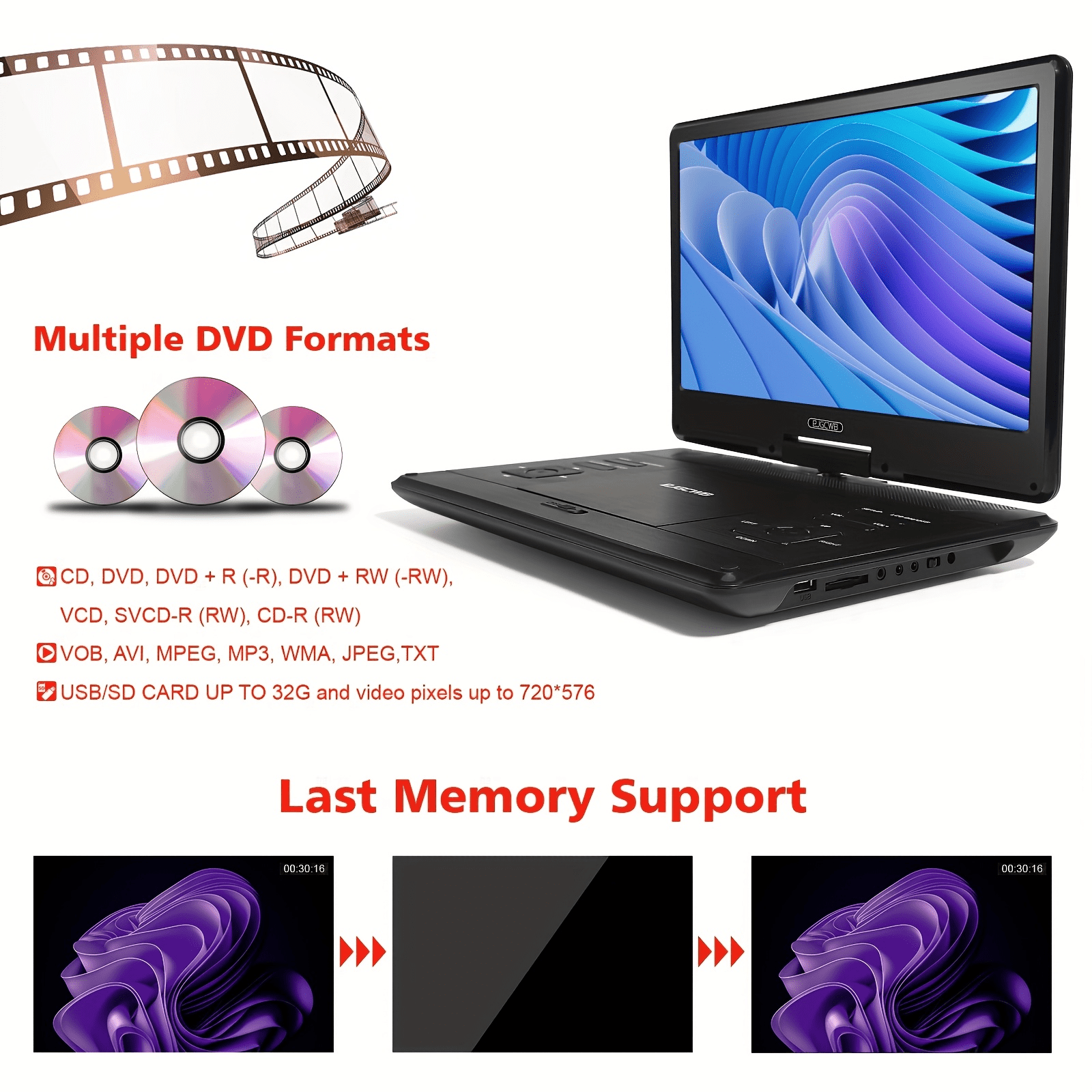 Portable DVD Player with 14.1"e; Large HD Screen, 4-6 Hour Battery, USB/SD/TV Sync, Region Free, Car Charger & AC Adapter, HDTV Output, Loud Speaker – for Car, Home, Travel – Black, Portable Dvd Player for Car, Car Entertainment, Foldable Design, Highqualit