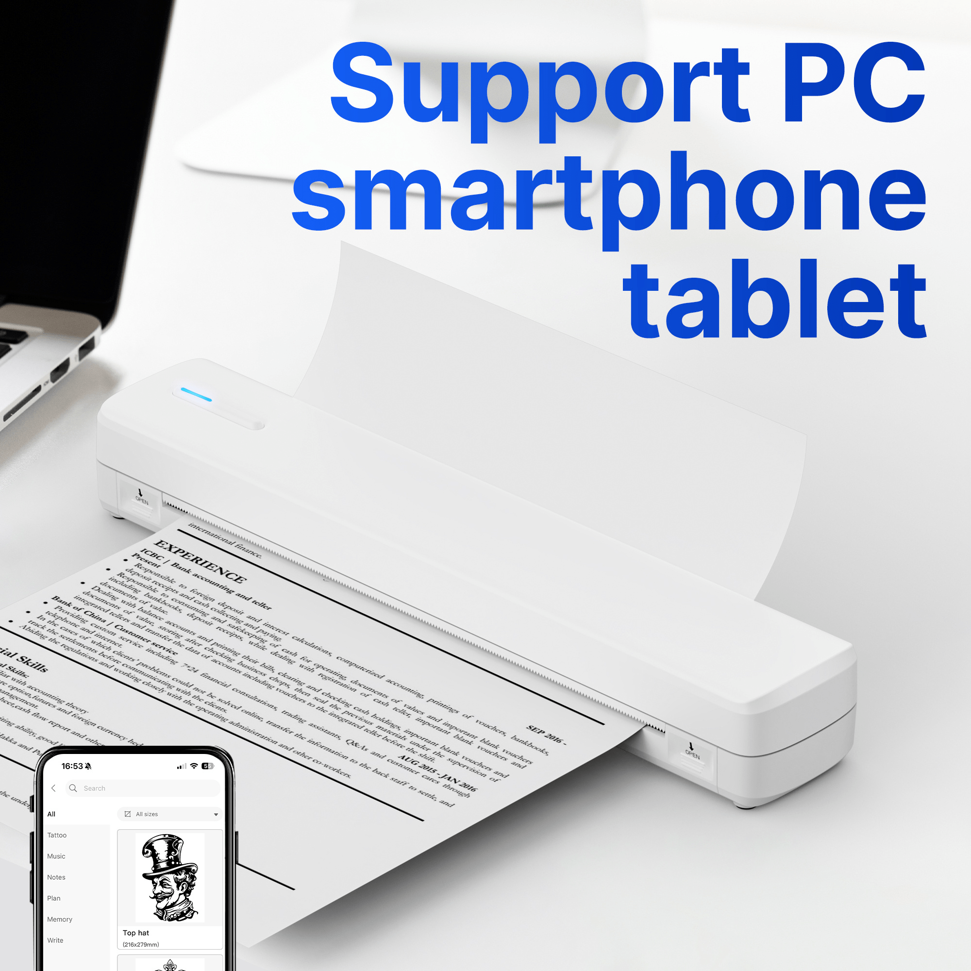 - 【Portable Printer】 This Printer Need to use Thermal Paper and DO NOT support regular copy paper. The portable printer is small in size and weighs only 1.17 pounds. This portable design allows you to print wherever you need. Whether it’s in your car, backpack, or during business travel, D810 wireless thermal printer is your reliable companion for office documents, inventory lists, business checks and more. This printer is also a tattoo stencil printer to print tattoo stencil paper. Please always remember to choose the paper size arroding to the paper you use both on Phone and PC.