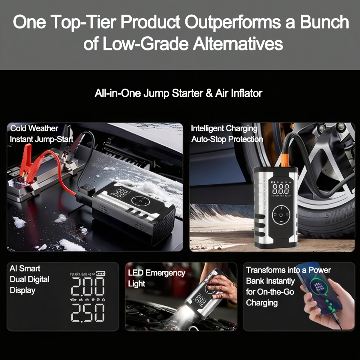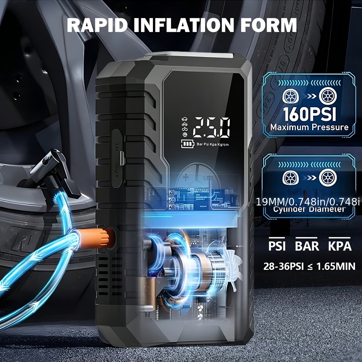 180 PSI High-Pressure Capacity: The unit utilizes a twin-turbocharged air compression cycle, allowing it to generate up to 180 PSI. This is not merely about peak power; it’s about “Flow Rate.” The system can inflate a standard $205/55\text{ R16}$ car tire from $0$ to $35\text{ PSI}$ in under 5 minutes, significantly outperforming legacy battery-operated units.