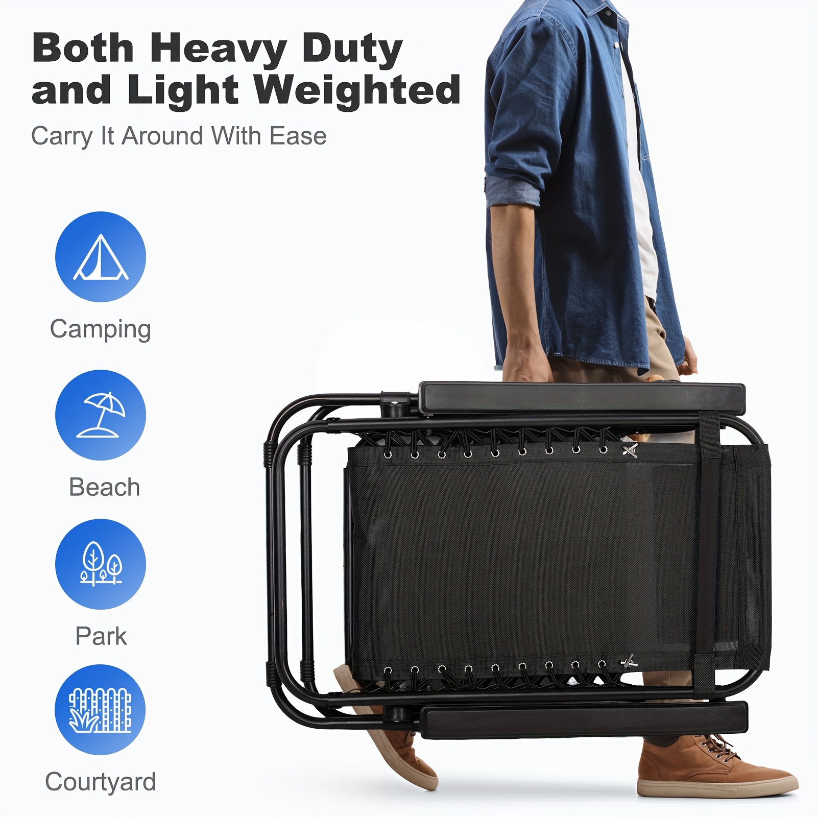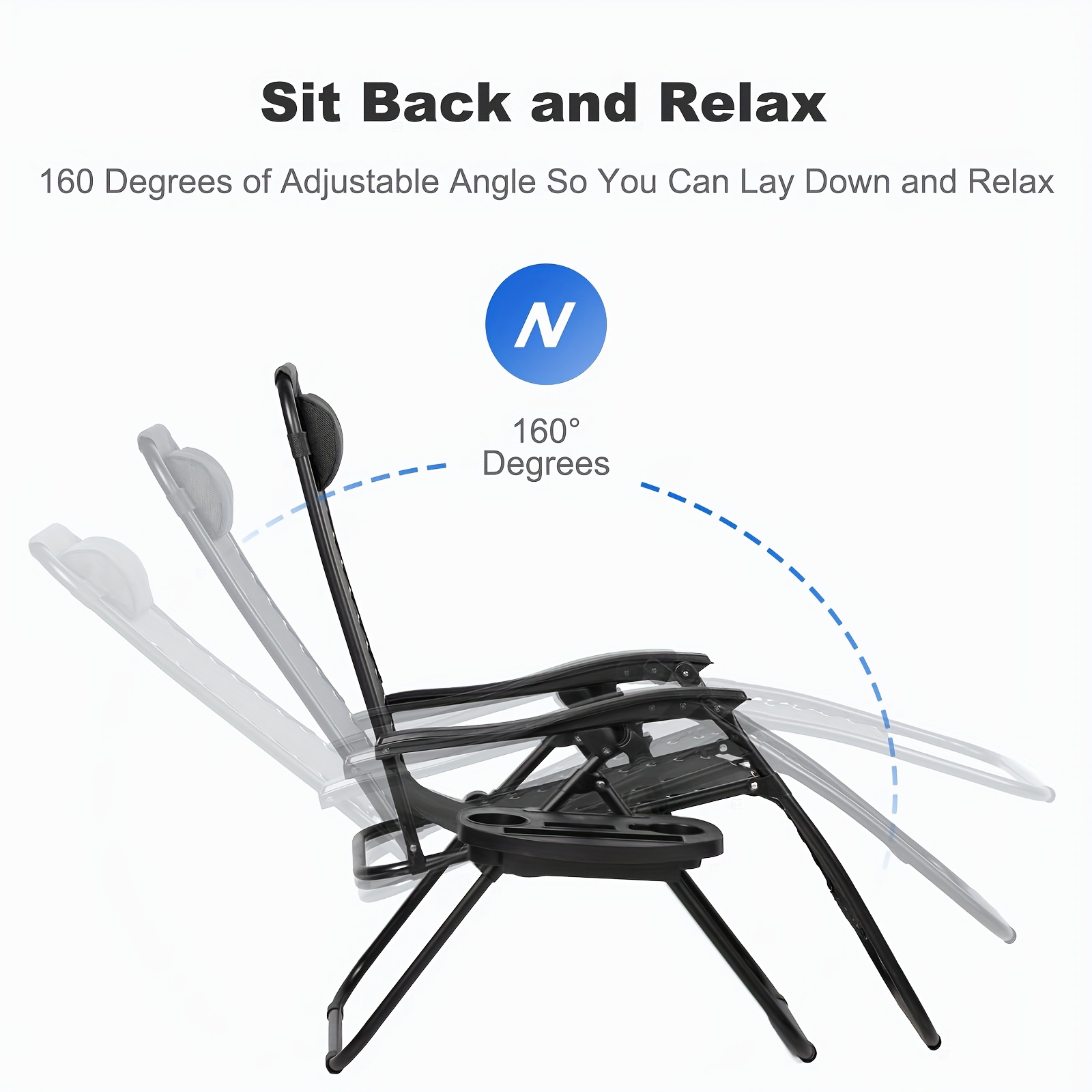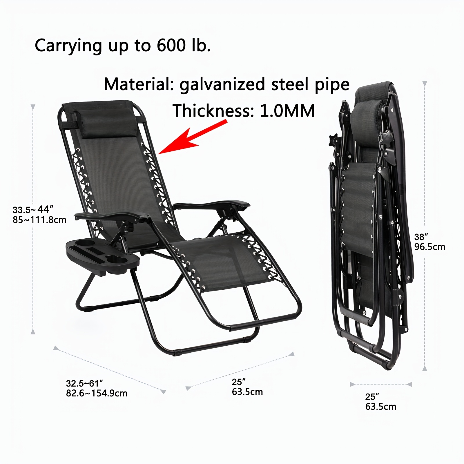 Our Zero Gravity Lounge Chair Recliners provide exceptional comfort with a stylish black steel mesh design. The reclining system can be locked, and the adjustable elastic cords adapt to your weight for a customized experience. These chairs are lightweight and foldable, making them easy to transport for any outdoor activity. They come with a removable tray that includes cup holders and device holders, and they are sturdy enough to support up to 300 pounds.