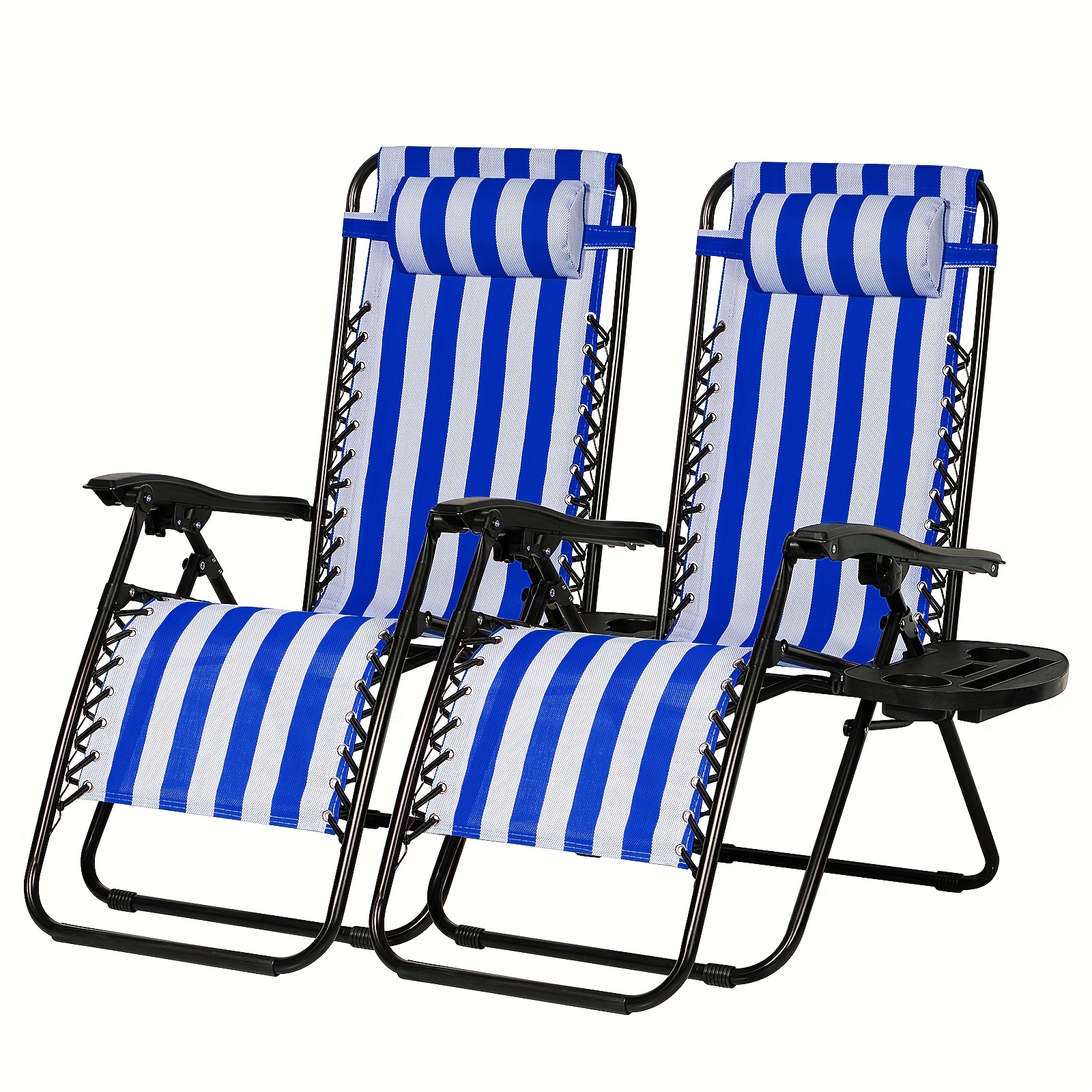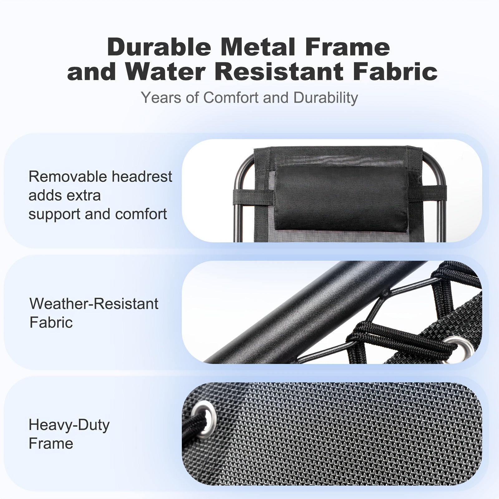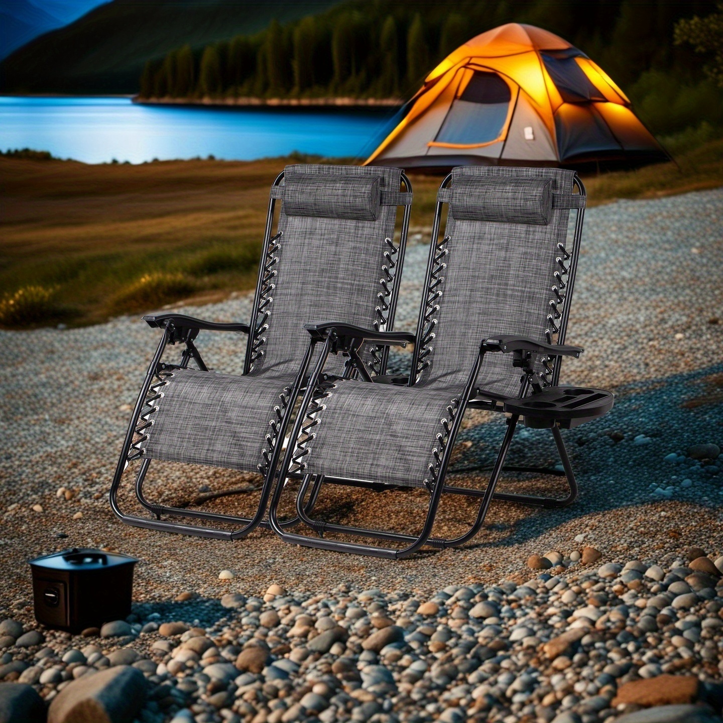 Our Zero Gravity Lounge Chair Recliners provide exceptional comfort with a stylish black steel mesh design. The reclining system can be locked, and the adjustable elastic cords adapt to your weight for a customized experience. These chairs are lightweight and foldable, making them easy to transport for any outdoor activity. They come with a removable tray that includes cup holders and device holders, and they are sturdy enough to support up to 300 pounds.