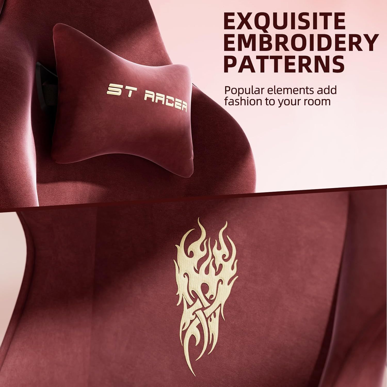Opulent Fabric and Style: This Velvet Upholstered Gaming Chair material and an inverted triangle embroidery technique, giving it a sleek and elegant appearance, perfect for your home or office. Equipped with a high-density sponge cushion that rebounds well, it remains comfortable even after prolonged use. The soft, breathable, and skin-friendly fabric minimizes sweating, while also being durable and resistant to tearing.